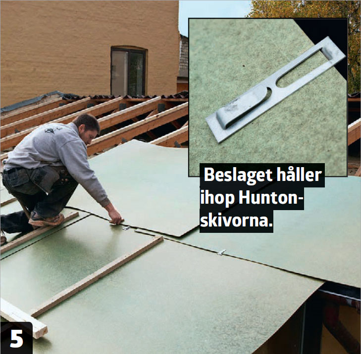 Nu ska själva Hunton-taket på. Hunton är gjort av pressat och impregnerat träfiber som kan avleda vatten som kommer utifrån och absorbera eventuell fukt som kommer inifrån. Skivorna överlappar varandra, så att ovälkommet vatten leds ner till takfoten och via fotplåten ner i hängrännan. Den här sortens undertak har dessutom en viss stabiliserande verkan på taket, eftersom skivorna spikas fast precis som andra takskivor eller råspont.