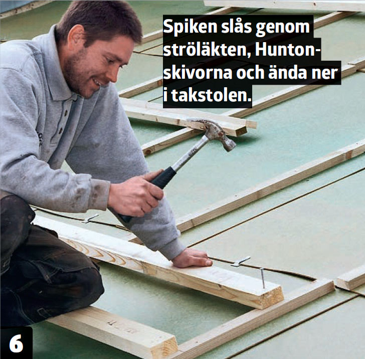 Spika fast ströläkt på Hunton-skivorna och ner i takstolarna, så att det inte är någon risk för att skivorna flyttar sig.
