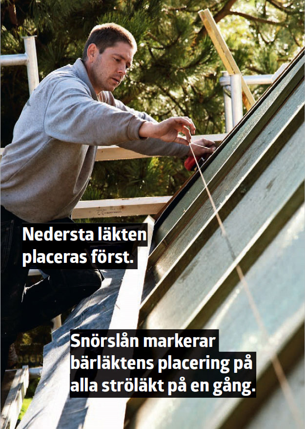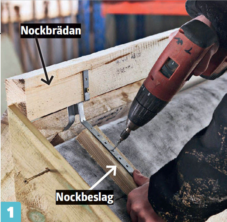 Börja med nockbrädan. Skruva fast en regel längs med taknocken med särskilda nockbeslag, som fästs på ströläkten på båda sidor på taket. Därefter kan den översta läkten fästas med beslaget.
