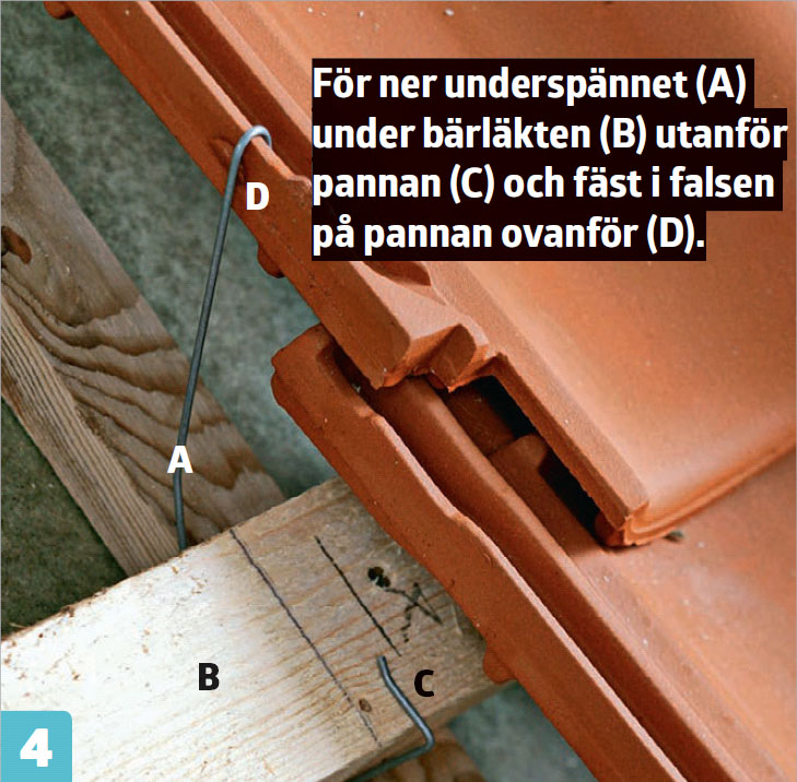 Varannan takpanna ska fästas inne på själva taket, men takpannorna i nedersta och översta raden samt alla runt om fönster och plåtdetaljer ska fästas.