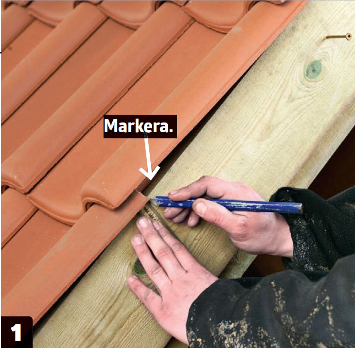 Börja med att markera. Skruva upp vindskivan så att den går ända upp mot takpannorna, som på bilden, och markera var varje takpanna slutar.