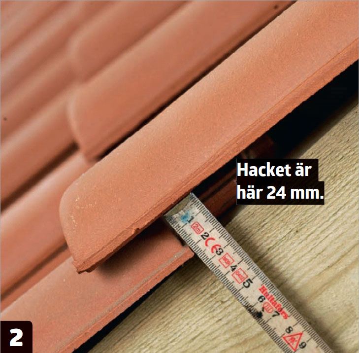 Mät hur djupa hacken ska vara. Här är det 24 mm, men kolla även de andra takpannorna, så att du vet att dina hack får rätt storlek.