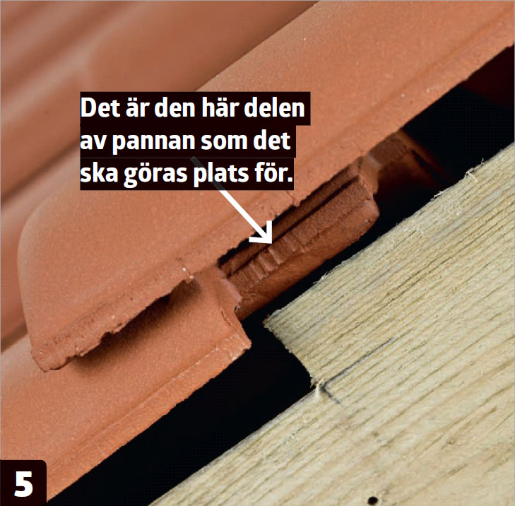 Stäng ute småfåglar, löv och drivsnö genom att montera ett fågelband. Det ska sitta så högt upp att takpannorna inte ligger på det utan på fotplåten. Här är det 5-6 cm.