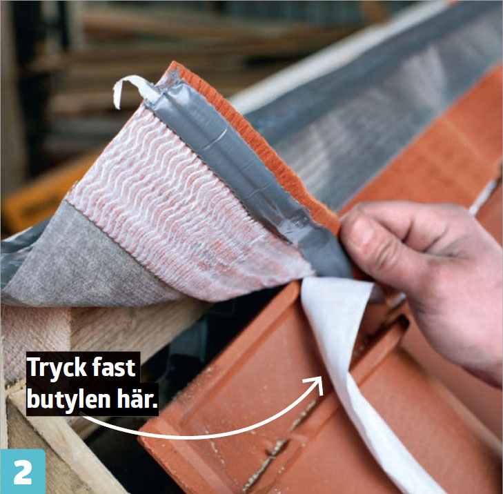 Se till att det blir helt tätt genom att trycka fast bandet ner mot takpannorna. Vissa sorter har en fals överst, andra är helt släta, men metoden är densamma.