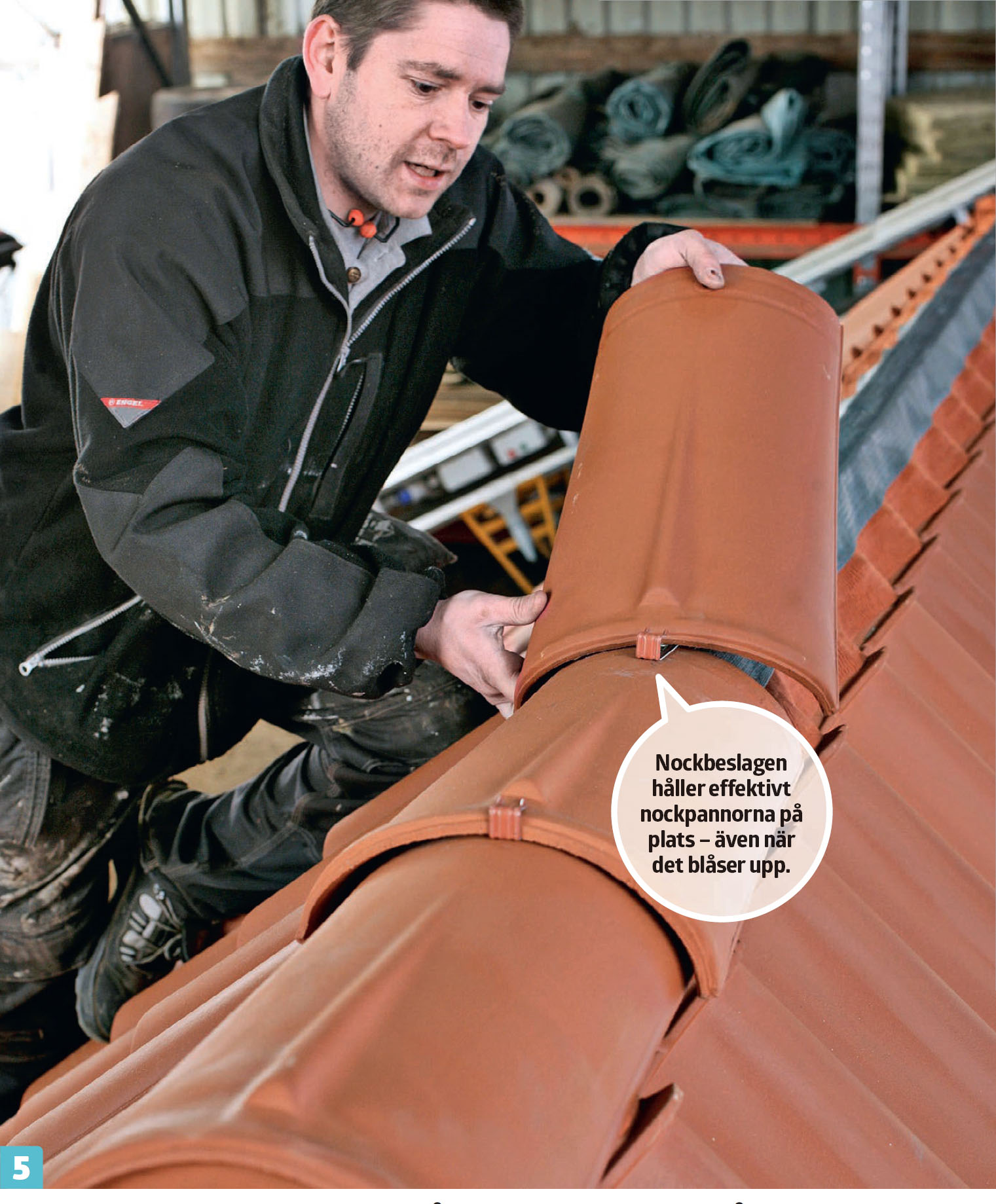 När takpannorna på sidorna och de tre översta raderna är på plats, ska du lägga nockpannorna. Det ska du göra medan du fortfarande når och kan stå stadigt på bärläkten i stället för att behöva hänga på taket i en sele. Nockbrädan är redan på plats; nu ska den bara kläs in, vilket dels ska se till att taket får ventilation, dels hålla borta eventuell yrsnö. Det görs med ett nockband som fästs överst med klammer och tätas med butyl på den översta raden takpannor. När det sitter är det bara att lägga och fästa nockpannorna.