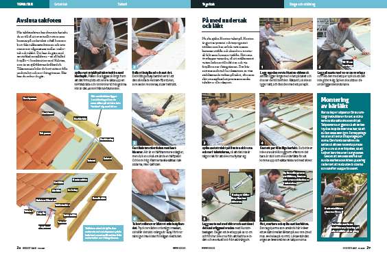 Takläggning har en stor fördel - man kan verkligen se att det händer något. Och det roligaste är när takpannorna läggs på. Det är ett tungt arbete att baxa upp pannorna på taket, så här är det bra att ha hjälp av många par händer. Pannorna på sidan kan behöva förborras och ska skruvas fast, och det är inte lätt att borra i dem. Du ska använda en slagborrmaskin med ett diamantborr för klinker. Borren slits dock snabbt, så köp några stycken. Och så är det så klart enklast att borra när du står på marken och kan lägga pannorna på ett par bockar eller liknande.