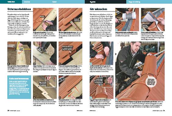 De yttersta raderna läggs först. De lodräta raderna takpannor längs vindskivorna skruvas fast, så att du blir helt säker på att de sitter kvar. Här finns det ju inte några “grannar” som kan hålla fast dem.