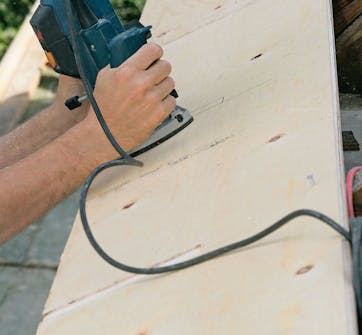Med en handöverfräs gör Henning spår för rännkrokarna. De skall sitta på samma nivå som skivans ovansida, så att den efterföljande takpappen kommer att ligga helt plant.