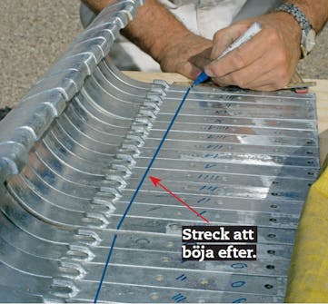 Rännkrokarna böjs med ett specialverktyg vid strecken. Verktyget har hyrts där hängrännorna köptes och det är inte svårt att använda när man lärt sig knepet.
