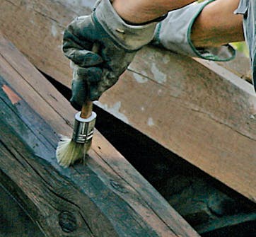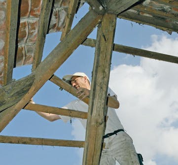 De gamla takstolarna förbereds för skivorna i underlagstaket. Spiken dras ut med spikutdragare och resterna av de gamla pannorna tas bort.