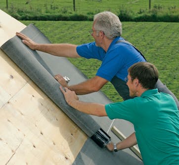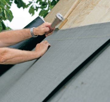 Den första våden takpapp rullas ut och rättas till så att den hamnar där den skall. Nederkanten klistras fast på takfotsbeslaget.