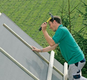 Först monteras den nedersta raden skivor. De har spont och not så att de kan skjutas ihop och därefter skruvas fast i takstolarna.