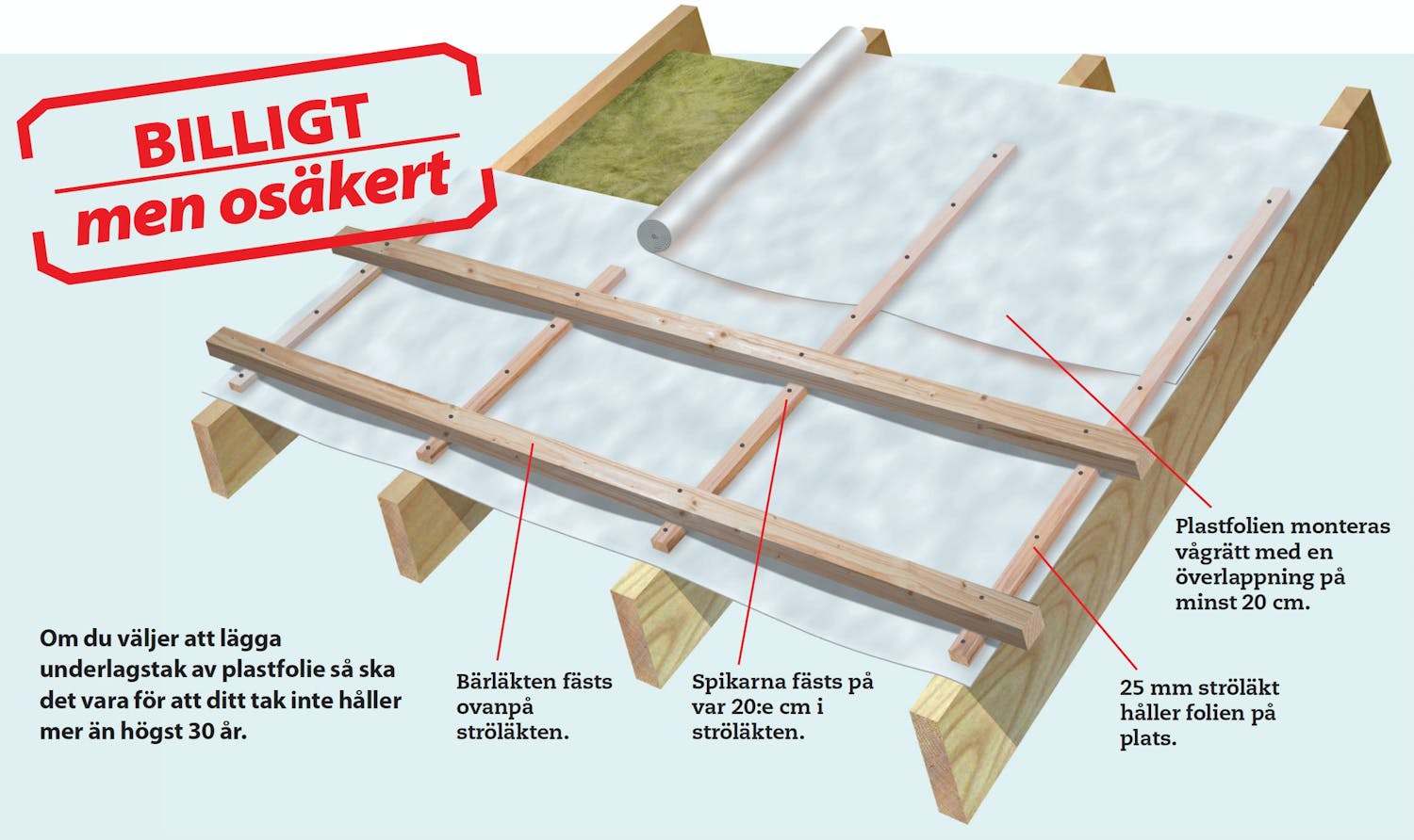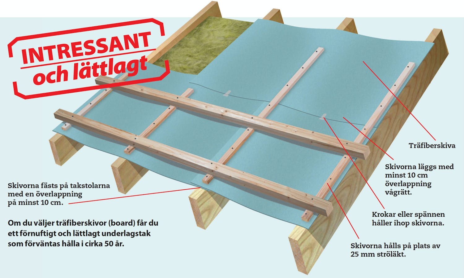 Underlagstaket hålls fast av ströläkt som kan spikas fast med spikpistol. När det är klart har taket blivit styvare på ungefär samma sätt som om man hade monterat råspont eller plywood.