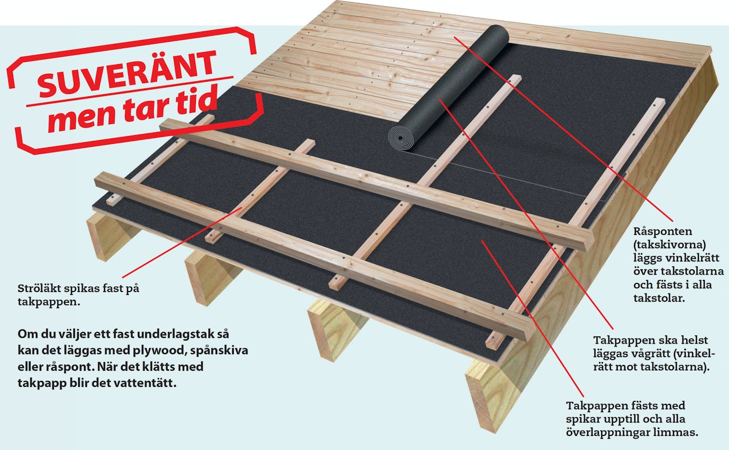 Takpappen läggs vinkelrätt på takstolarna och spikas samt limmas i överlappningar. Därefter läggs ströläkt och slutligen bärläkt för takpannor eller ståltak.