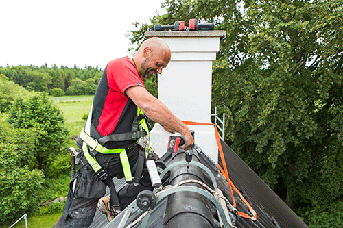 Kom ihåg att vatten rinner neråt. Det får inte tränga ner vatten bakom takpannorna så därför börjar du tätningen runt skorstenen nerifrån. Då kommer varje följande del att ligga ovanpå den föregående och göra det helt tätt.