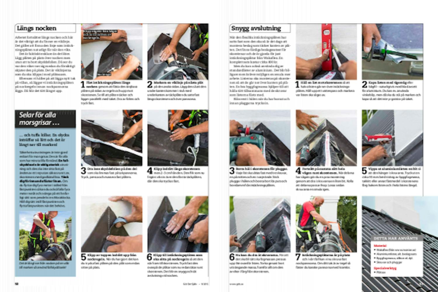 Dra loss skyddsfolien på den del som ska limmas fast på takpannorna. Tryck, pressa och massera fast plåten.