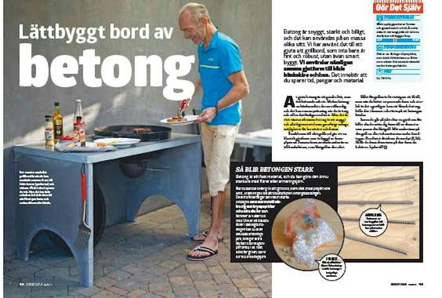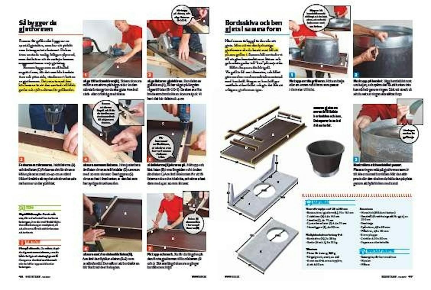 Formen för grillbordet byggs av en speciell gjutskiva, som har ett ytskikt som betongen inte fastnar i. Du kan även använda vanlig, billigare plywood, men det kräver att du smörjer formen noggrannt innan varje gjutning.