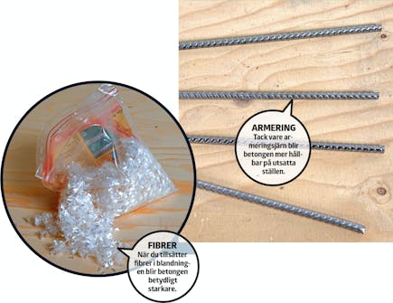 När du blandar betong till ditt grillbord, eller vilket annat projekt som helst, är det en god idé att tillsätta fibrer i betongblandningen. De extra fibrerna gör den redan starka betongen ännu mer motståndskraftig mot krympsprickor och andra skador som kommer av väder och vind. Utöver att tillsätta fibrer i betongblandningen kan du även använda armeringsjärn, som ger extra styrka till de svagare partierna, t.ex. runt hålet för grillen, där vi har två armeringsjärn.