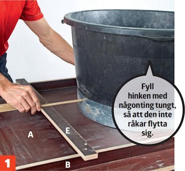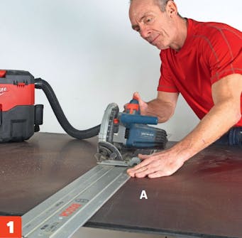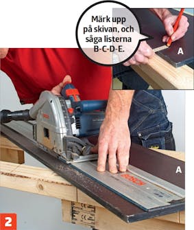 Såga till bottenskivan (A). Skivan ska vara minst 5 cm större på bägge sidor än den största betongytan du ska gjuta. Använd sänk- eller cirkelsåg med skena.