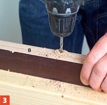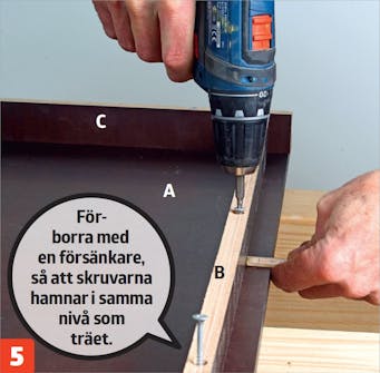 Förborra för skruvarna. I sidolisterna (B) och ändlisten (C) förborras det för skruvar. Hålen placeras med 30-40 cm avstånd. Hålen försänks så mycket att skruvhuvudena hamnar under ytskiktet.