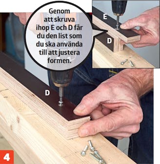 Skruva samman listerna. I den justerbara ändlisten skruvas två listdelar (D) samman med 30 mm skruvar. Överliggaren (E) skruvas fast i överkanten av den list som har synliga skruvhuvuden.