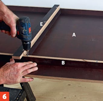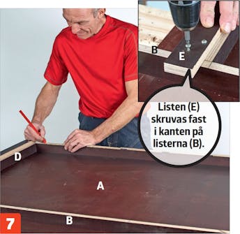 Sidolisterna (B) skruvas på. Mät upp och fäst listen (B) i ena långsidan och i änden (ändlisten C). Använd skivkanten för att få listerna raka och vinkelräta, och skruva fast dem med 4,5 x 50 mm skruvar.