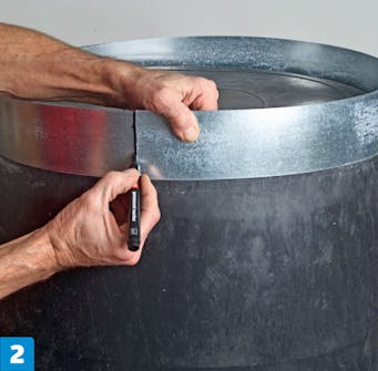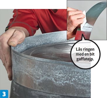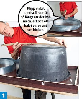 Märk upp på bandet. Lägg bandstålet runt om baljan, och spänn det så att botten inte kan nå helt genom ringen. Sätt ett streck så att du vet var ringen ska sättas ihop.