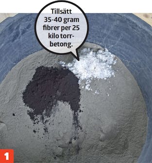 Häll torrbetong i en murarhink. Tillsätt fibrer och pigment i önskad mängd, och blanda det hela så att det blir jämnt innan du tillsätter vattnet.