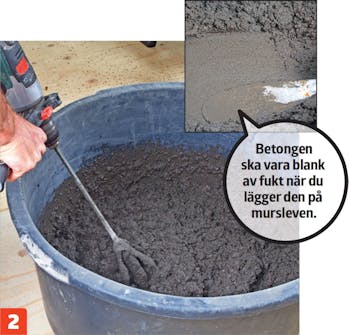 Tillsätt vatten och blanda. Häll 3,5 liter vatten per. 25 kg torrbetong i en spann, och tillsätt vatten i flera omgångar. Blanda nog-grannt med en visp i en kraftig borrmaskin i minst 3 minuter.