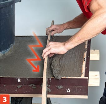 Dra ut betongen. Fördela blandningen jämnt i gjutformen och pressa ihop den med en murslev. Dra av överskottsbetongen med kanten av en bit list eller en bräda med raka kanter.