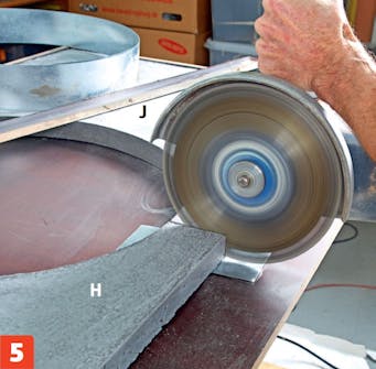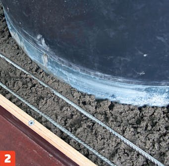 Hålet ska passa din klotgrill. Vår grill är 54 cm i diameter, och hålet görs med en rund murarhink monterad med bandstål. Ringen av bandstål ger vertikala sidor i hålet och gör det lätt att avlägsna gjutformen igen.