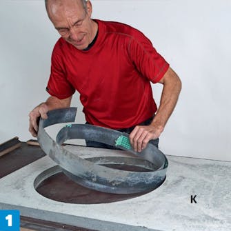 Samma form används till bordsskivan (K). Rengör skivan (A), listerna (B-CD+E) och ringen, innan du sätter igång. Enda skillnaden är längden på formen och placeringen av hålet. Dessutom armerar vi de smala sidorna mellan hålet och kanten lite extra med två armeringstänger.