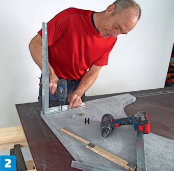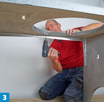 Bordet är tungt och robust, och det är faktiskt inte helt nödvändigt att skruva fast det i gavlarna. För säkerhets skull använder vi dock två vinklar för att sammanfoga gavlar och bord. Skruva ihop dem med 4,5 x 30 mm skruv i en plugg, och förborra innan. Avslutningsvis limmas skarven mellan bordsskivan (K) och gavlarna (H och J) med kakelfix eller fogmassa.