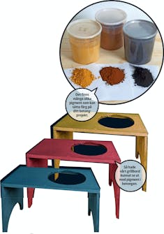 Betongfärg i pulverform kallas oxidpigment, ett namn som kommer från att färgerna innehåller järnoxid. Med järnoxid får du nästan obegränsade möjligheter när du färgar ditt projekt, och färgen håller riktigt bra. Ett kilo pigment kostar ca. 150 kr. Blan-dingsförhållandet ska vara fem procent pigment och 95 procent torrbetong om färgen ska hålla.