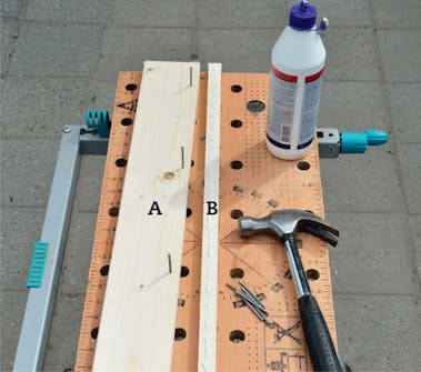 Gör klart för hopsättning av ben av sidana A och B. Delarna sätts ihop två och två. Fäst fyra dyckertar i den breda brädan A 10 mm från kanten och stryk sedan lim på den smala brädan B.
