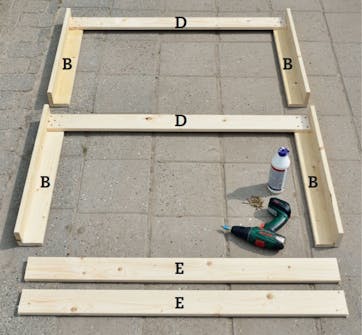Förbered hopsättningen. Förborra för skruvar i sidorna D och E och stryk lim på täckbrädorna C. Även nu använder du 4 x 35 mm skruvar. De ska främst hålla ihop delarna medan limmet härdar.