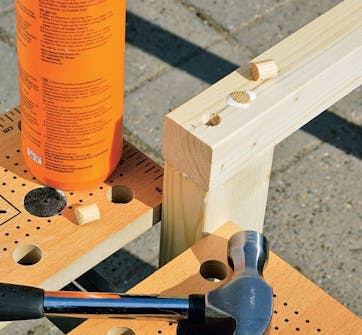 Pluggarna kapas av en 12 mm rundstav. Se till att de är en smula längre än djupet i hålen. Stryk lim i hålen och knacka ner pluggarna.