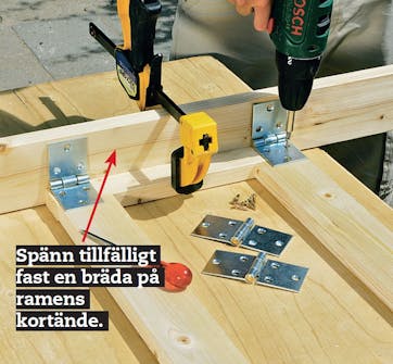 Lägg ramdelarna på en skiva med vinkelräta hörn. Spänn fast delarna med tvingar och skruva ihop ramarna med 6 x 100 mm skruvar.
