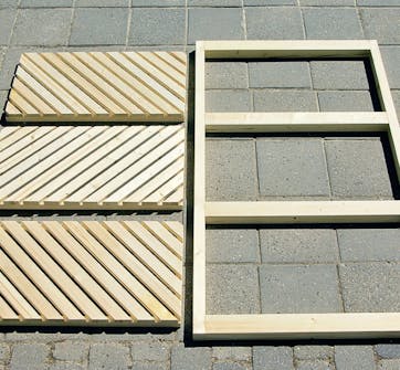 Ramarna i både bord och bänk fyller vi igen med 22 x 45 mm lister. De kapas i 45 grader i båda ändar, och då är det förstås bra att ha en kap- och geringssåg. Listerna placeras i fiskbensmönster. Du kan välja ett annat mönster om du hellre vill det. Och vill du inte använda lister kan du lägga stenplattor på 40 x 40 cm i ramarna. Det kan vara praktiskt om du vill sätta varma saker på bordet. Du kan också såga till plywood- eller mdf-skivor på 40 x 40 cm och lägga i ramarna.