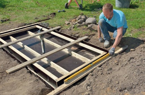 Kontrollera att ovansidan av betongen är vågrät. Ju bättre betongen ligger nu, desto lättare är det att få formen på plats. Det lönar sig att vara mycket noggrann innan formen läggs på.