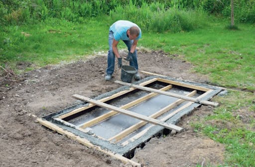 Betongen hälls ut i din utgrävning. Den är enklast om du ställer blandaren så att du kan hälla rakt ner i hålet i stället för att kärra blandningen i skottkärra.
