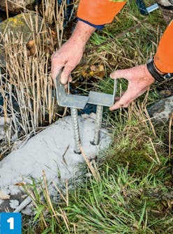 Hade vi haft berggrund kunde vi ha fortsatt med att borra och limma fast bryggan, men i den mjuka jorden väljer vi att gjuta en grund av betong. Och istället för stolpskor förankrar vi balken med gängade stänger, så att vi kan låsa fast den med muttrar på ovansidan.