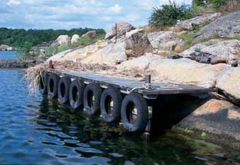 Det kan vara besvärligt att anlägga en brygga i skärgården, där klipporna ofta stupar brant ner i havet. Här har man löst problemet genom att montera en galvaniserad stålkonstruktion i form av en ram på klippan samt ett par stålstolpar. Ramen har sedan fyllts med gångbrädor.