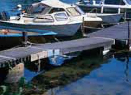 Bryggorna har anlagts längs med och som förlängning av en vågbry-tande pir. På utsidan av träbryggorna har man slagit ner stolpar.