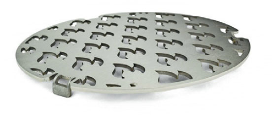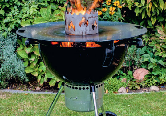 GRILLGALLRET på 20 cm kan antingen läggas direkt över hålet i plåten eller ovanpå insatsen. Då går det även att grilla biffarna.