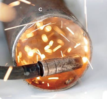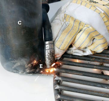 Svetsa fast ett handtag (F) till gallret mitt på röret (C). Skär till 12 cm av ett entumsrör och placera handtaget mitt på röret på den motsatta sidan av järnbiten.