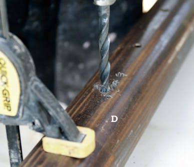 Borra 5-10 hål i röret (D) med ett 10 mm borr. Då kan du dra grillgallret uppåt och nedåt. Ritsa en mittlinje på röret innan du borrar så att hålen kommer att sitta i rak linje med varandra.