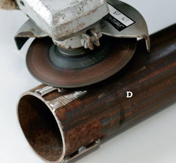 Svetsa fast den lilla järnbiten (E) på röret (C). Järnbiten skall binda ihop rör och galler. Biten skärs till med vinkelslip.