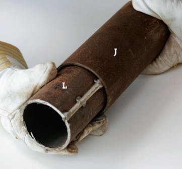Gör ett lock (H) till röret (D). Banka lite på baksidan av locket så att det blir konvext (buktar utåt) innan du svetsar fast det på röret.