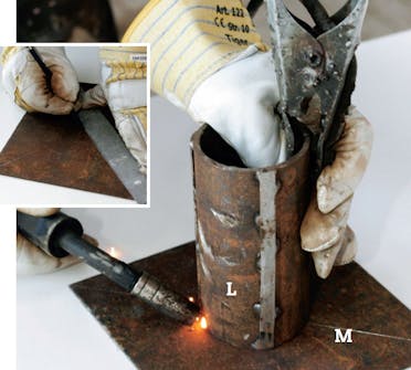 Svetsa fast röret (L) på fotplattan (M). Röret skall sitta exakt i mitten. Plattans mittpunkt får du fram genom att ritsa diagonalerna.